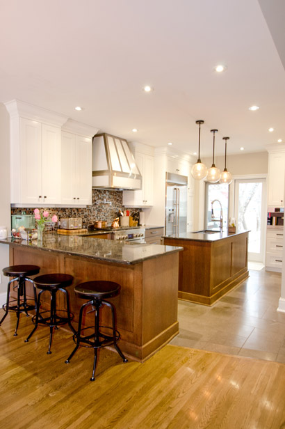 The original home was a 1926 2-storey 1,790sf home with a full basement. Inside the original portion of the house, a beam was installed to open up the entire main floor for kitchen and dining area. Patio doors were added that could walk out to a deck with built-in BBQ and hot tub area which then walks down to a private courtyard dining area. The original home had three bedrooms and a full washroom upstairs and cosmetic finishes upgraded these areas. The addition involved knocking down a single attached garage that had been added in the 1960’s to make room for a 1,060 square foot addition. On the main floor, the addition is a triple garage, workshop area, mudroom, and powder room. Upstairs the addition has a family room, second floor balcony, master bedroom, and large ensuite. Significant care and attention was put into the design of the addition to match original rooflines, window sizes, and trim details. Cast iron radiators were salvaged from an old RCMP station that was being demolished and repurposed for the heating in the addition. Originally the attic was unconditioned space and this project included sprayfoaming the underside of the complete roof system to provide insulated attic space. Inside the attic, an air handler was added with ductwork distribution including humidifier, air conditioning, and HRV. The end result was the cozy comfort of a boiler heating system in the cold winter months but a comfortable air conditioned home for the hot summer days. The addition seamlessly integrates with the original part of the home and all trim were custom made to match throughout. The only giveaway that this home wasn’t an original 2,850 square foot home is that they didn’t commonly build triple attached garages back in the 1920’s.